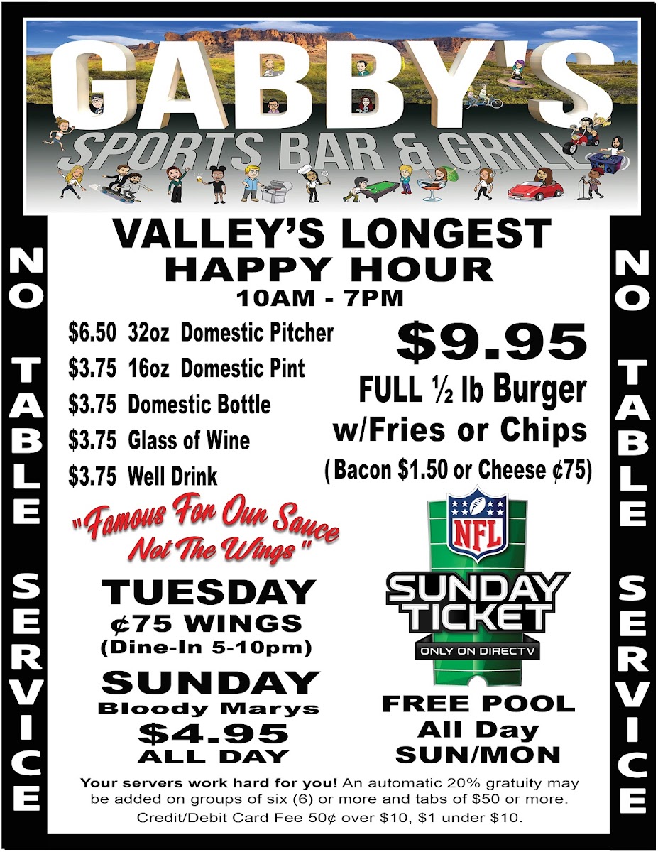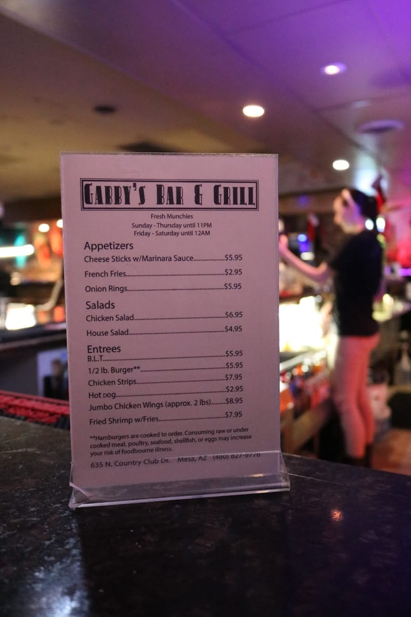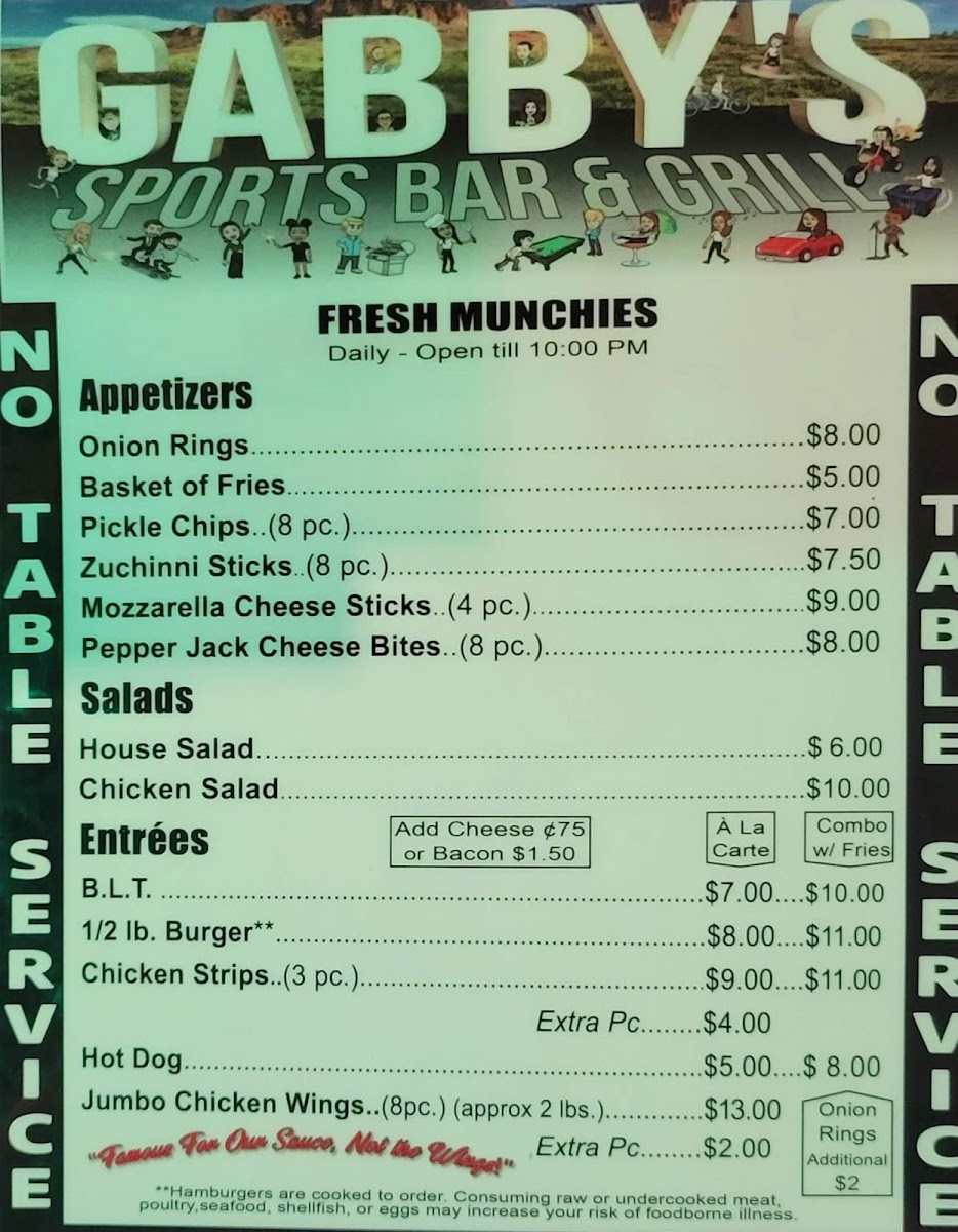 Introducing the menu at Gabby’s Sports Bar and Grill, located in Mesa, AZ, brings a delightful blend of American classics and comfort food. With a relaxed atmosphere perfect for unwinding, the menu features a variety of options that cater to all tastes. Start your meal with crispy Jumbo Chicken Wings, expertly fried and grilled, paired with their signature sauces for added zing. The homemade 1/2 lb Burger is a standout, served fresh with crispy fries, showcasing the cook's skill in classic American fare. For lighter options, indulge in the Chicken Salad or House Salad, providing a refreshing contrast to heavier dishes. A selection of savory sandwiches, including the BLT, rounds out the offerings, all crafted with quality ingredients. Gabby’s not only excels in food but also in warm service, highlighted by attentive bartenders making it a must-visit spot for both food lovers and sports fans.